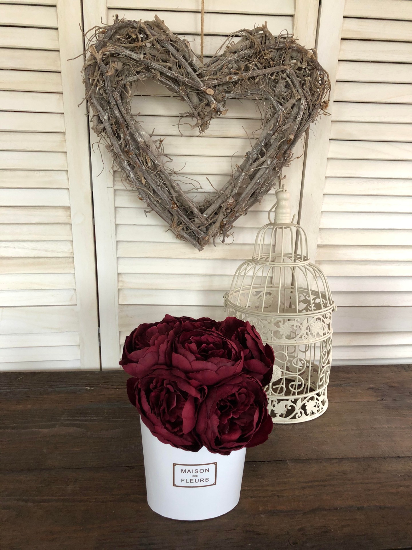 Fehér magasított virágdoboz elegáns franca felirattal, 6 db burgundi színű bazsarózsával, A virágdoboz magassága a virágokkal együtt 30 cm.