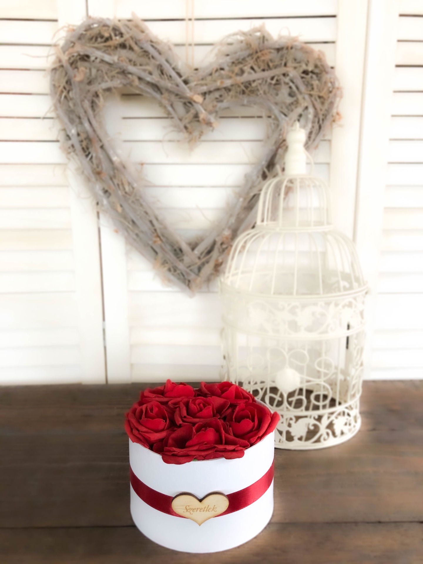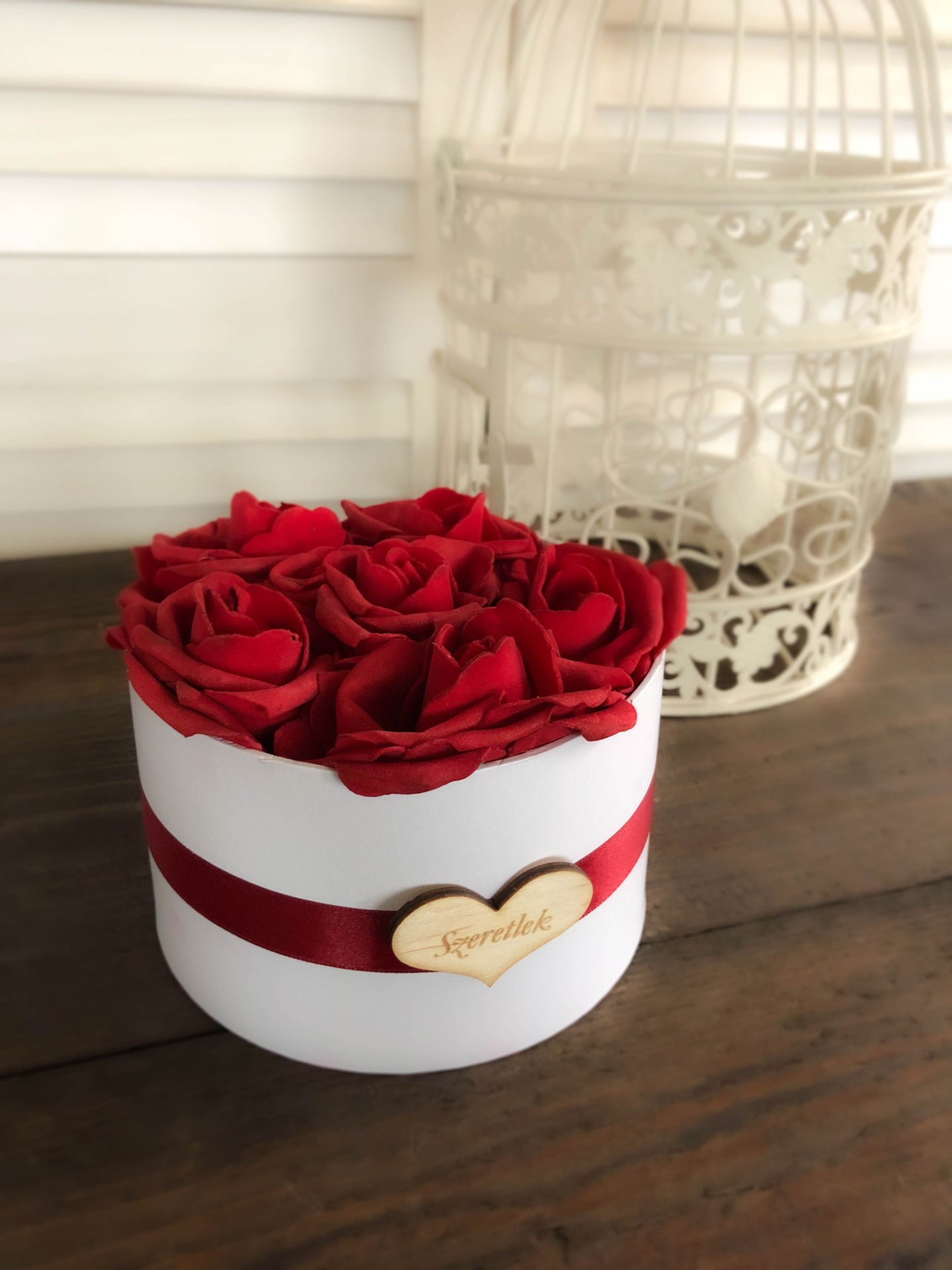 Rózsadoboz 6 db nagyfejű vörös habrózsával, fa "Szeretlek" feliratú szív táblával, szatén szalaggal. A virágdoboz átmérője 12 cm, magassága 15 cm.