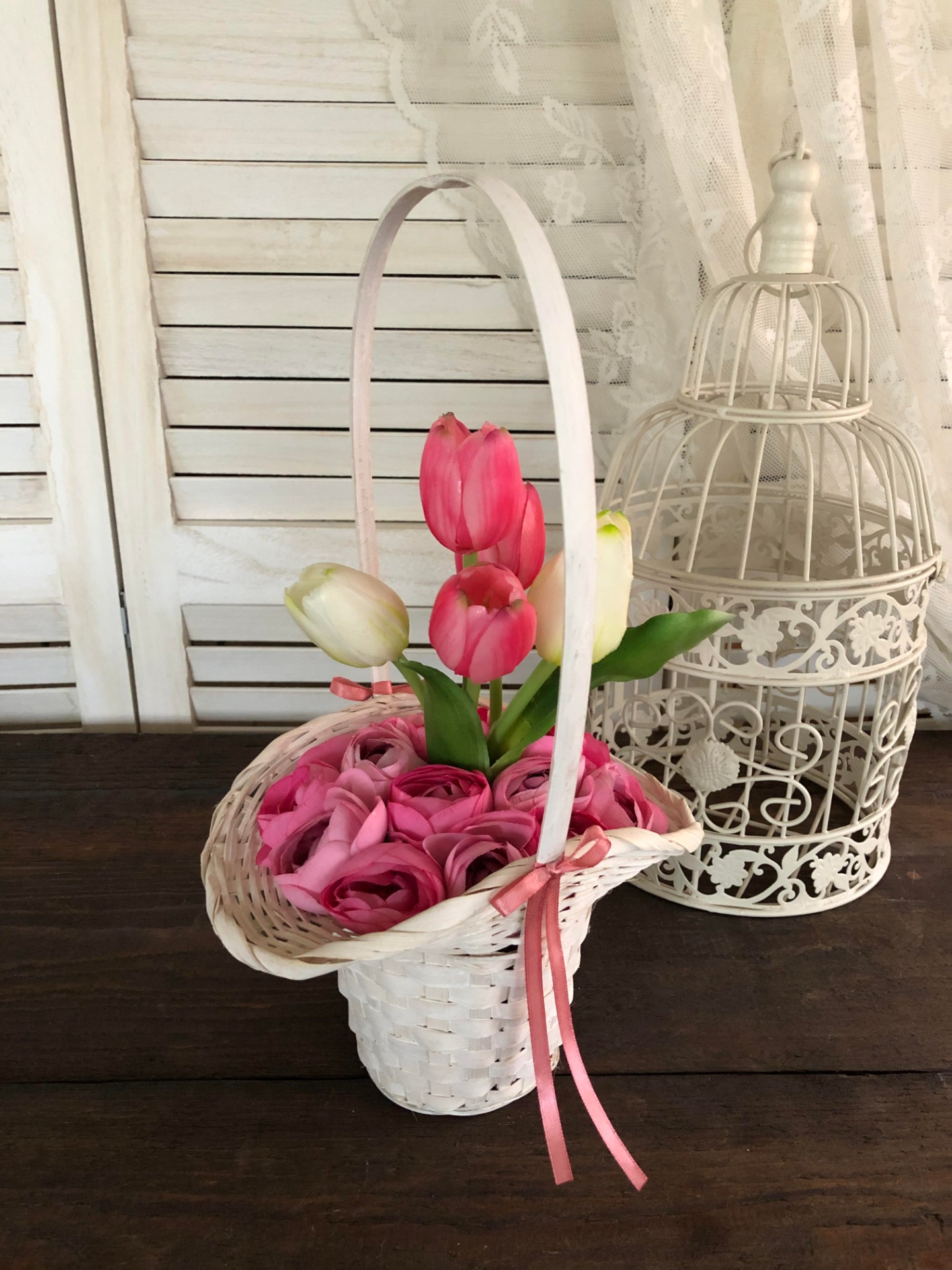 Kedves fehér kosárkában rózsaszín és pink selyembegóniák, 4 szál gyönyörű örök tulipánnal és apró, rózsaszín díszmasnikkal. Szeretetteljes ajándék bármely ünnepi alkalomra, vagy lehet egyszerűen egy bájos dekoráció, mely boldogságot visz a lakásba.