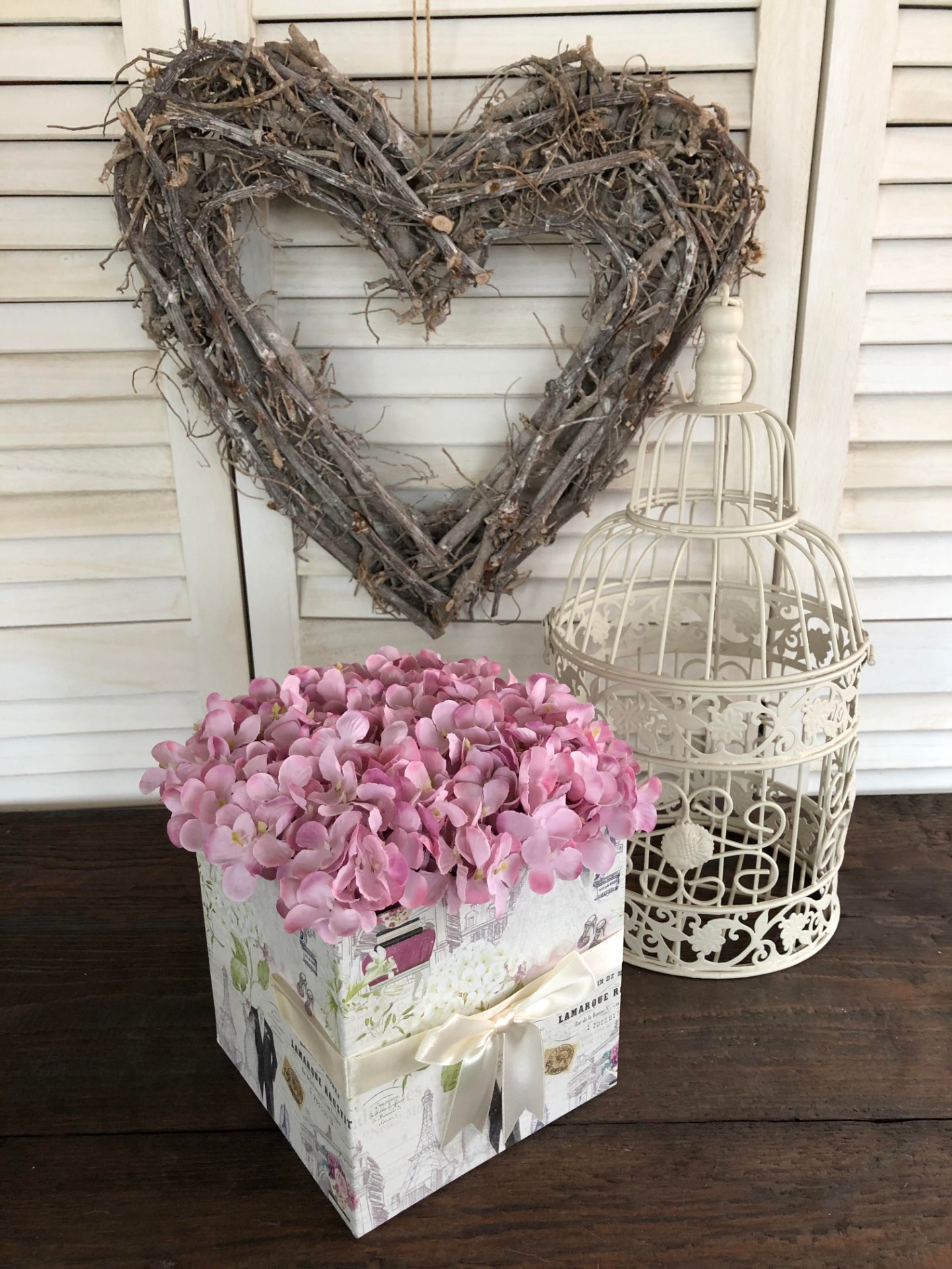 Francia esküvői mintás díszdoboz, ekrü színű szaténszalaggal, rózsaszín örök hortenziával. Magassága 25 cm.