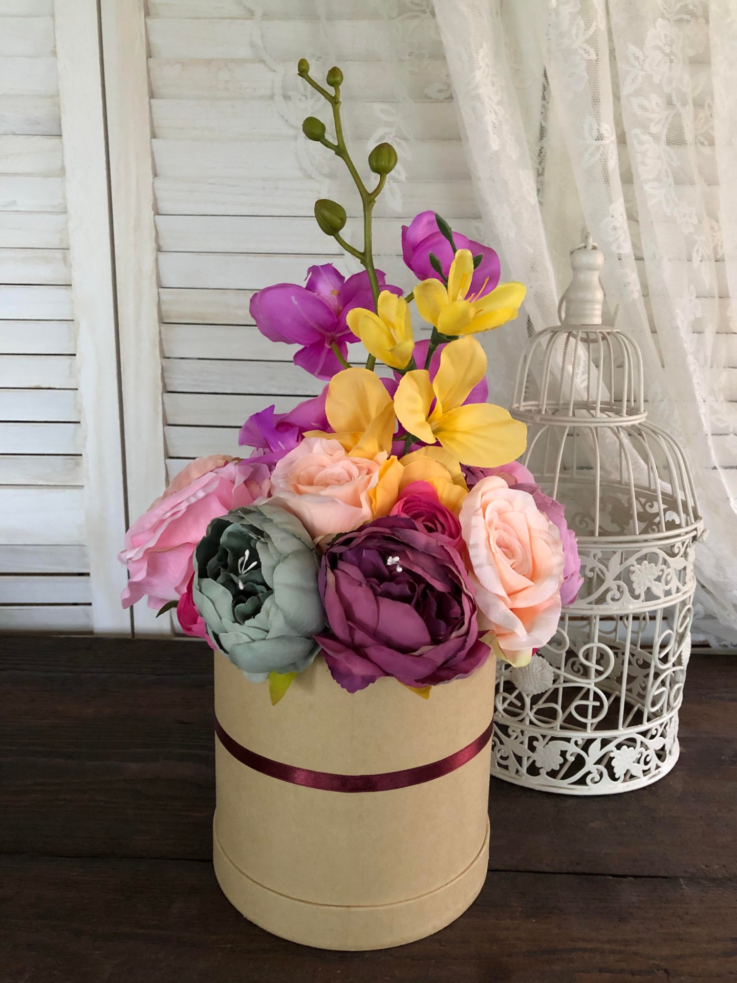 Natúr színű, magas díszdobozban színpompás örökvirágok gyönyörű kompozíciója: selyem bazsarózsák, rózsák, begóniák és egy szál frézia, és mint egy tündöklő korona, úgy magasodik a többi virág fölé egy szál élethű szilikon orchidea. Az Esszencia Enteriőr virágdobozok királynője.